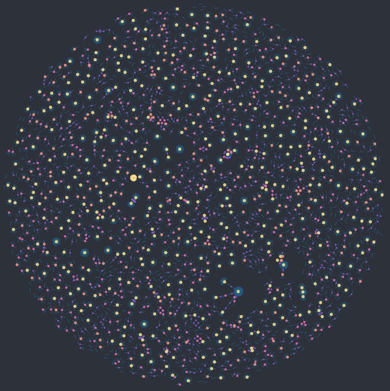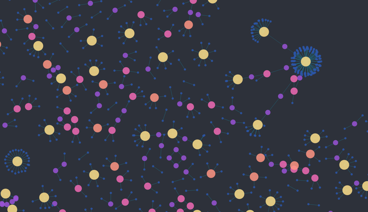 My heart was really happy when I saw this. Usually, with a graph at this scale, I don’t see this clarity. Even without zooming in, I can see a lot of life, a lot of structure. I love this latest release. The coloring is another nice improvement! I’ve removed labels so that you can see the shapes.