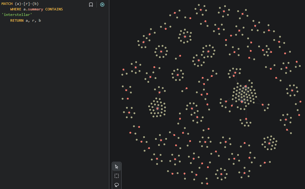 RETURN a, r, bMatch nodes and relationships where at least one of the nodes has a summary that contains the word interstellar.