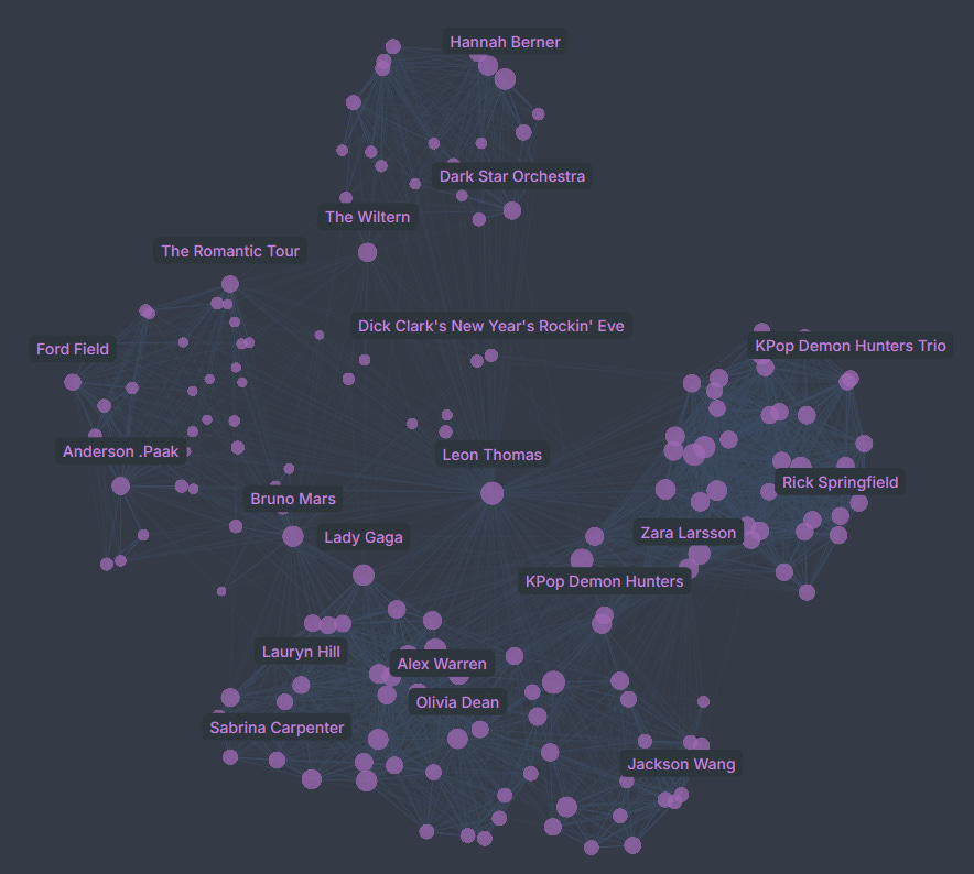 Dang. That’s impressive! Lady Gaga, Bruno Mars, Dark Star Orchestra, KPop Demon Hunters Trio, Lauryn Hill, Sabrina Carpenter. Enough said. That is one well-connected musician!