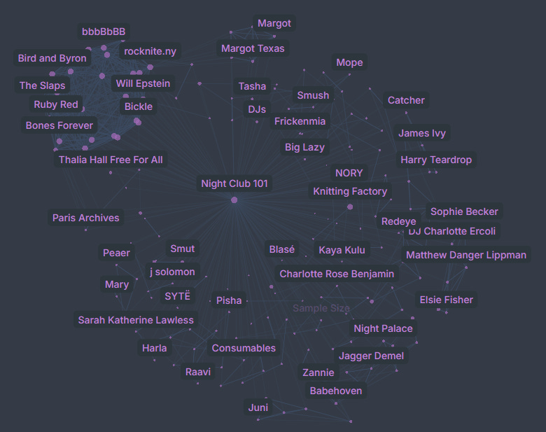 I am going to shrink the node scale to as small as possible so that it is easier to see things. If I look up Night Club 101 in Cosmograph, this is what I see: